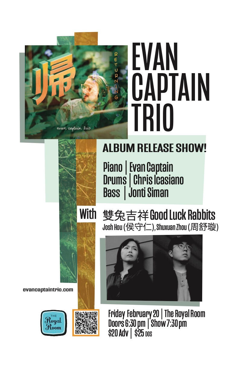 Debut album of original music by Evan Captain's jazz piano trio, titled 帰 Returning, out on 2/20 with Strange Moon Records! The album features Kelsey Mines on bass and Chris Icasiano on drums, and the performances range from introspective to raucous and joyful Americana jazz, exploring identity through art.Joined this evening by songwriter Josh Hou (侯守仁) and lyricist Shuxuan Zhou (周舒璇) and their project 双兔吉祥 Good luck Rabbits, whose songs capture diasporic lives and dreams—the sweet, the heartbroken, the outrageous, and the suspenseful. The music spans styles and genres, yet remains firmly planted in the Mandarin pop tradition.